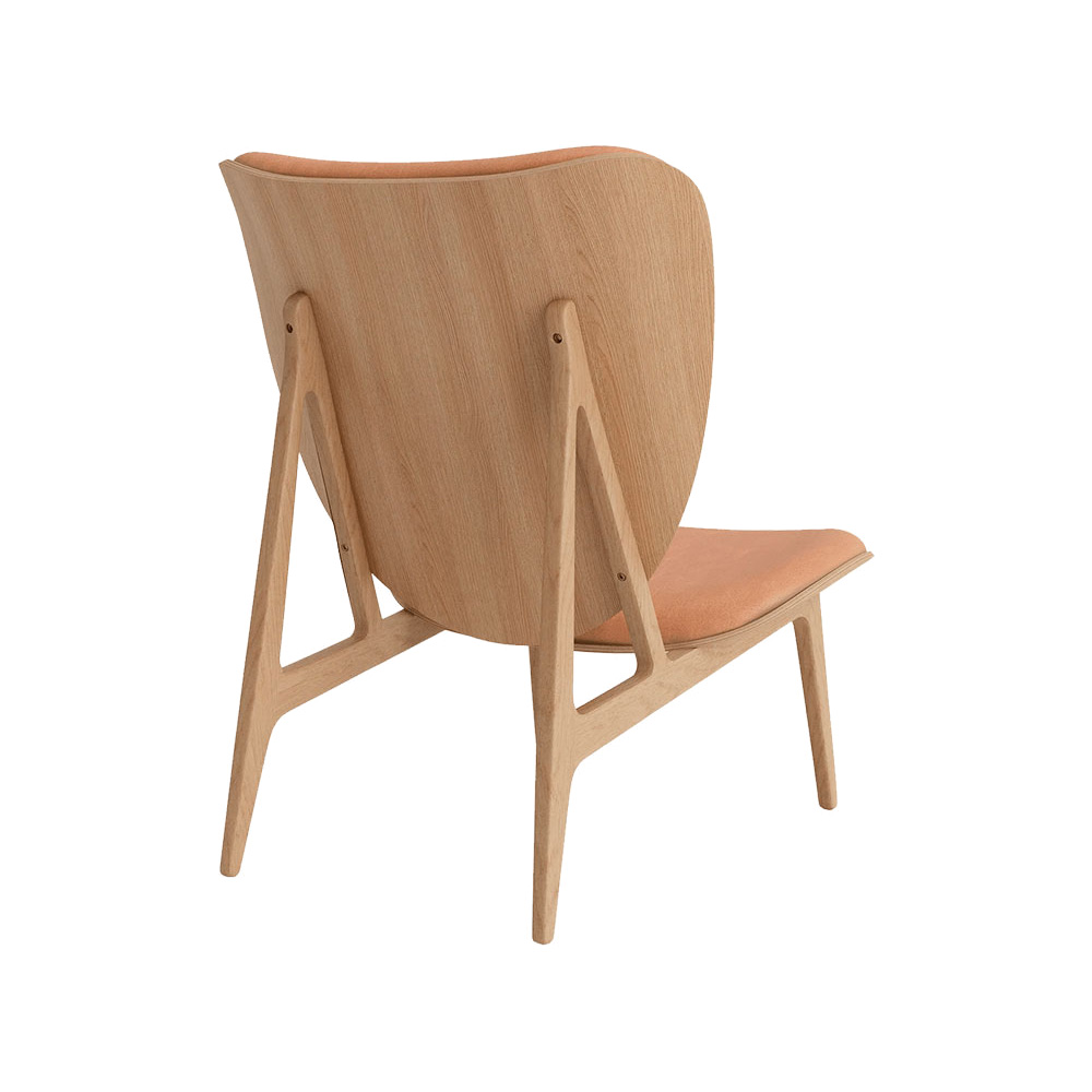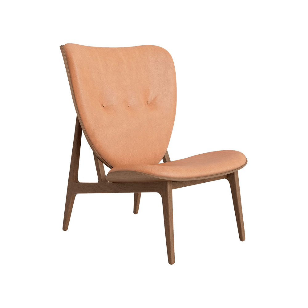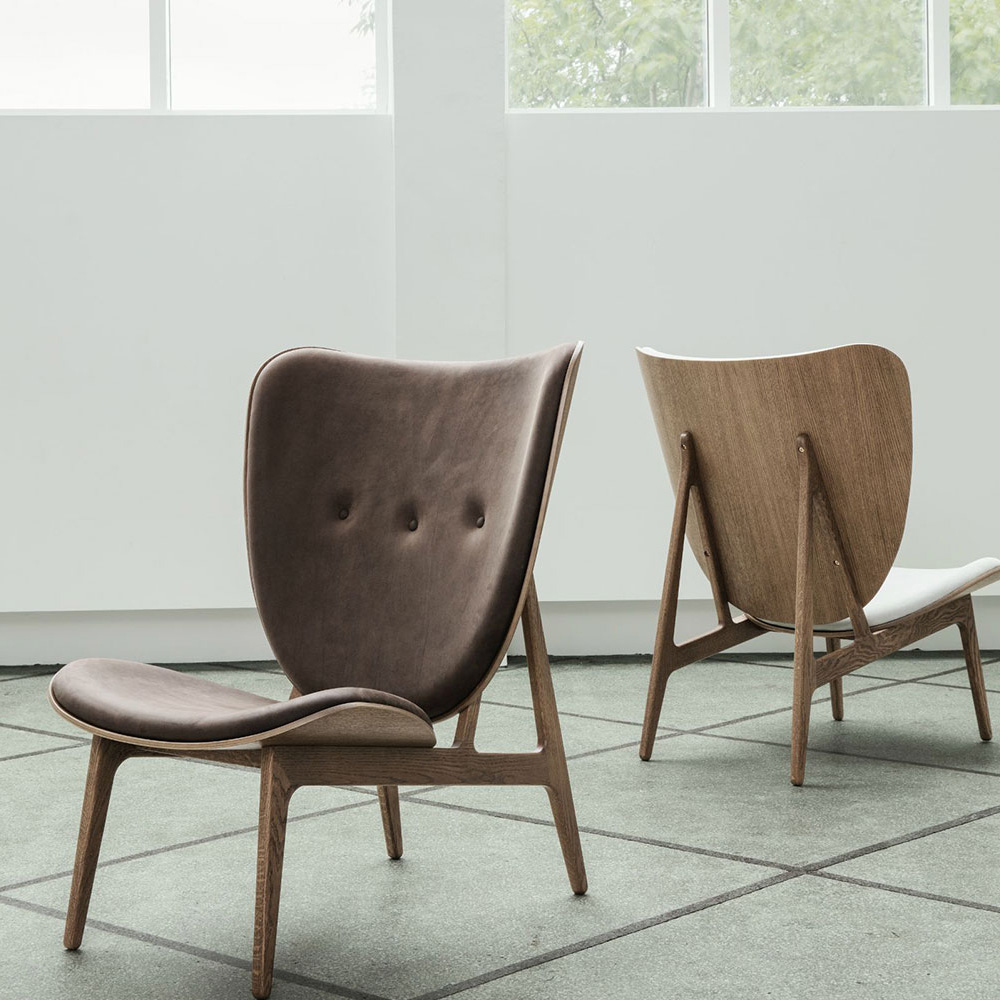 The Elephant chair is hand-crafted with a solid oak wood frame. The chair comes in three frame variations: Natural, Dark Stained and Black and can be upholstered with leather and wool.